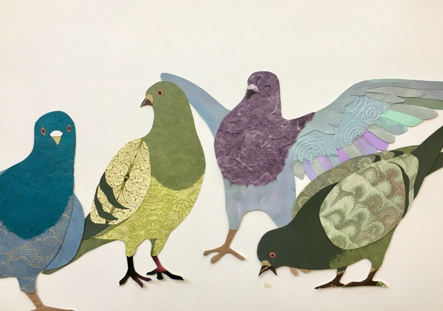 Among the original paper collage works I am exhibiting are images from my debut children’s book The Turtle Ship by Helena Ku Rhee, designs for Greeting Card Universe, and favorite images from my personal portfolio. I am also creating site-specific work for the occasion. Some pigeons will be coming to roost in the St. Agnes library stairwell for this August.