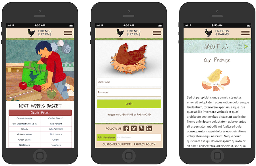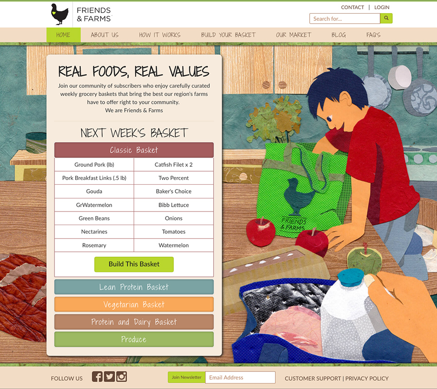 Friends & Farms was like a personal shopper for the dinner table. Every week the business assembled “baskets” of fresh produce straight from regional farms, then distributed them to customers from the back of a truck. Friends & Farms prided itself in stellar customer service and creating a sense of community. They thought my signature illustration style of collaged papers was the perfect medium to convey the friendly, down-to-earth, and easygoing spirit of their business.