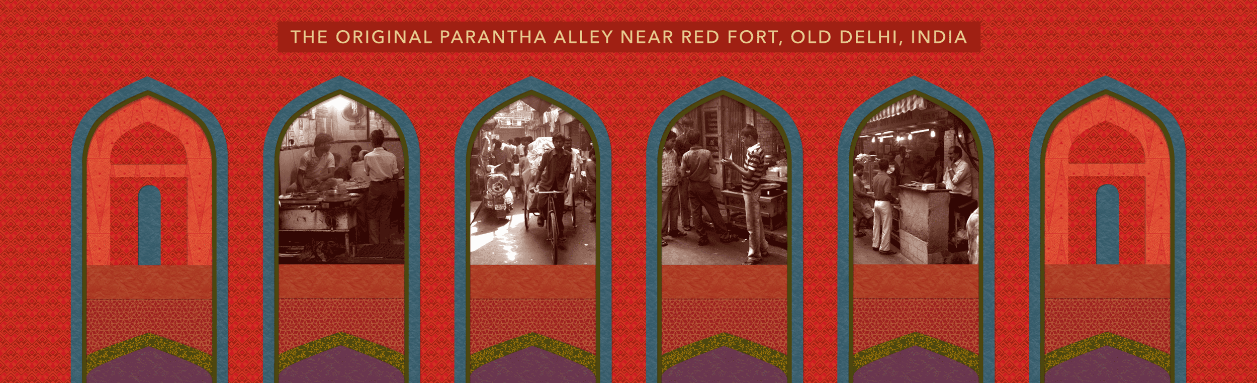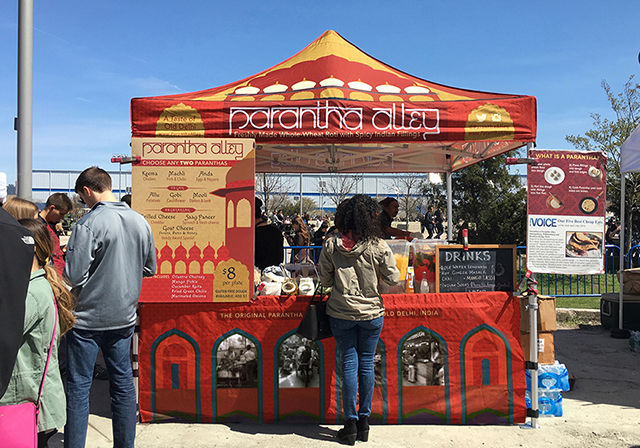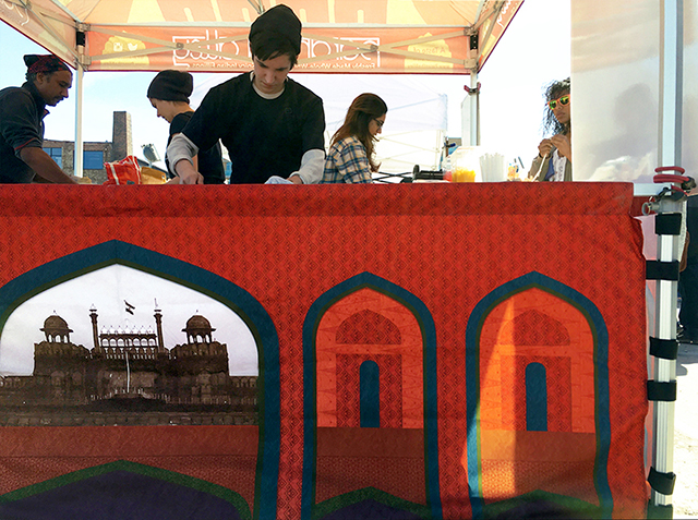 Parantha Alley is one of many fantastic food vendors at Smorgasburg, that gastronomic orgy that happens every summer weekend in Brooklyn. Parantha is shallow-fried Indian flatbreads filled with various meats and vegetables. The business wanted to stand out among the 100 vendors that make up Smorgasburg. The owners requested a tent design recalling the Red Fort (Parantha Alley in Old Delhi is around the corner from the historic Red Fort), and using my collaged paper style.
