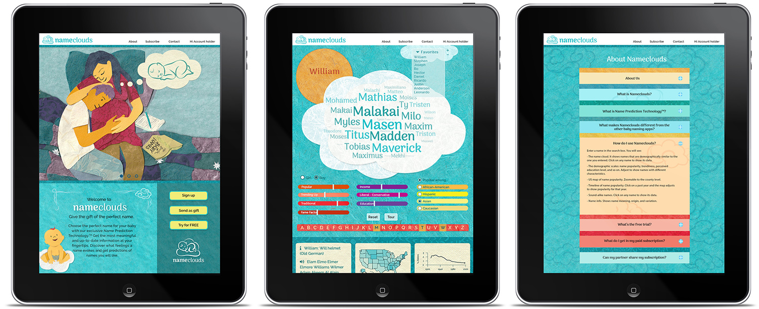 Nameclouds is to baby names what Pandora is to music. This fun app helps expectant parents think of names for their baby-to-be. The user enters a favorite name, and using data from the US Census and Social Security, the program predicts what names will appeal to the user. Dataworks invited me to illustrate and stylize the app and its website.