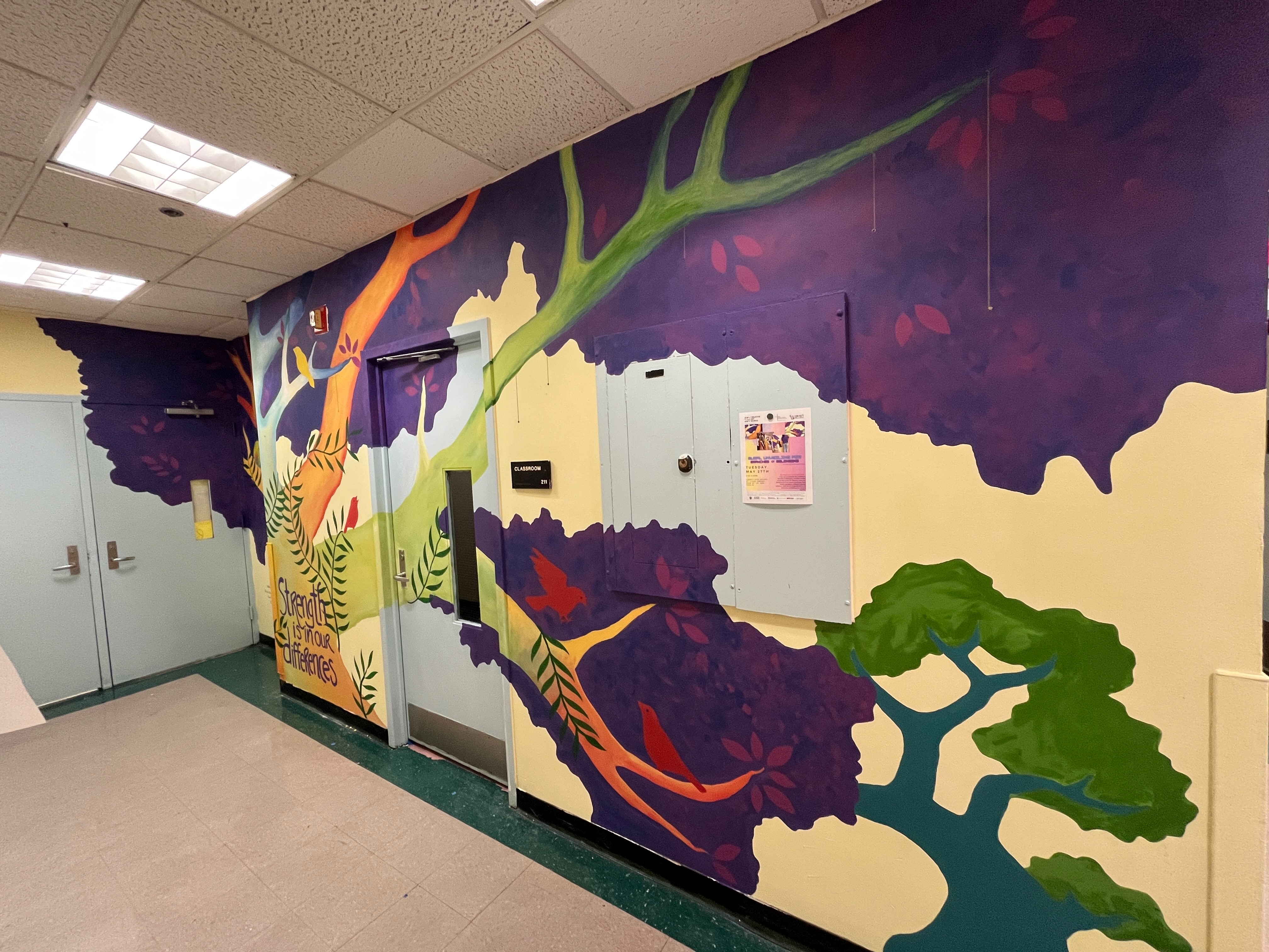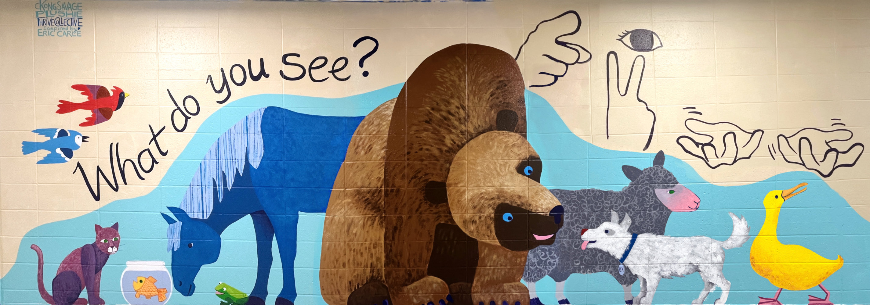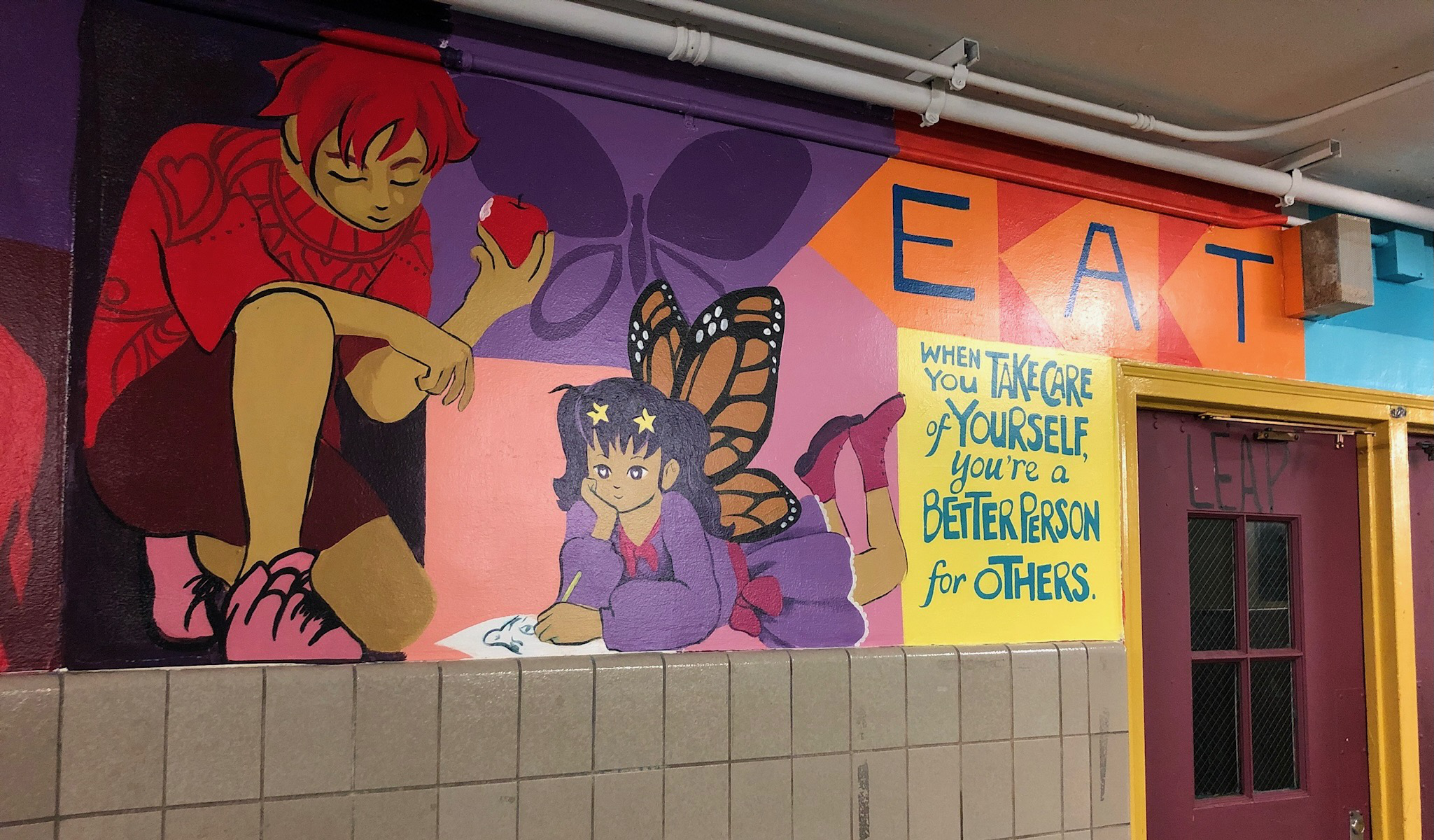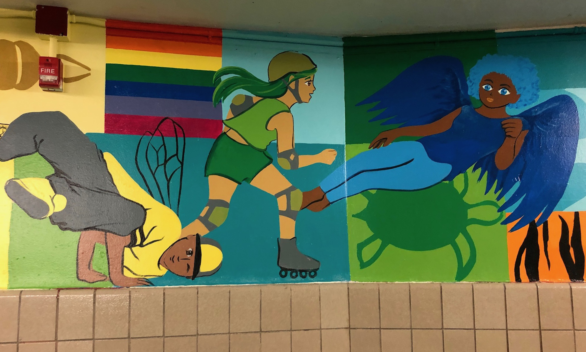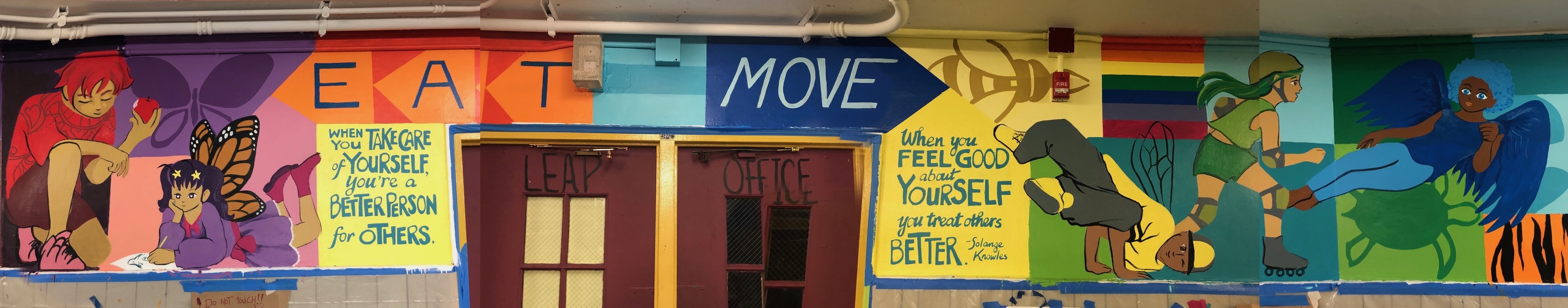 With older students, I engage as a muralist. Many people dread drawing. But everyone has ideas—ideas of who they are, observations about the world, thoughts they want to share. I tell students to make chicken scratch drawings with stick figures, diagrams with written notes. I gather their concepts and stitch them into a mural design. The most magical point is when students recognize their concepts in the mural. What a thrill to understand you have something worth sharing with the rest of the world. How meaningful it is to feel seen. Below are some of the walls we have painted together. Learn details about some of the works here in my mural section.