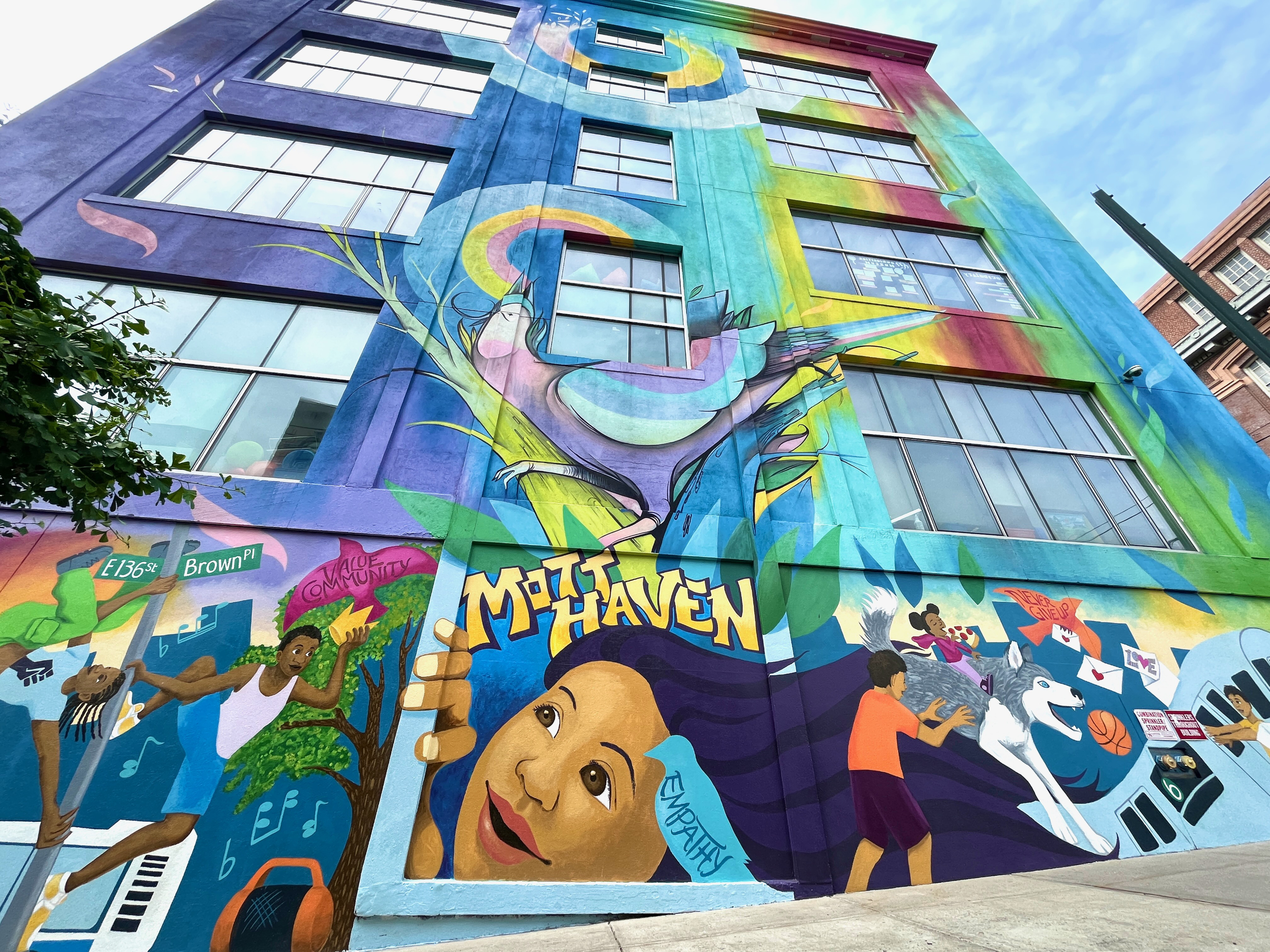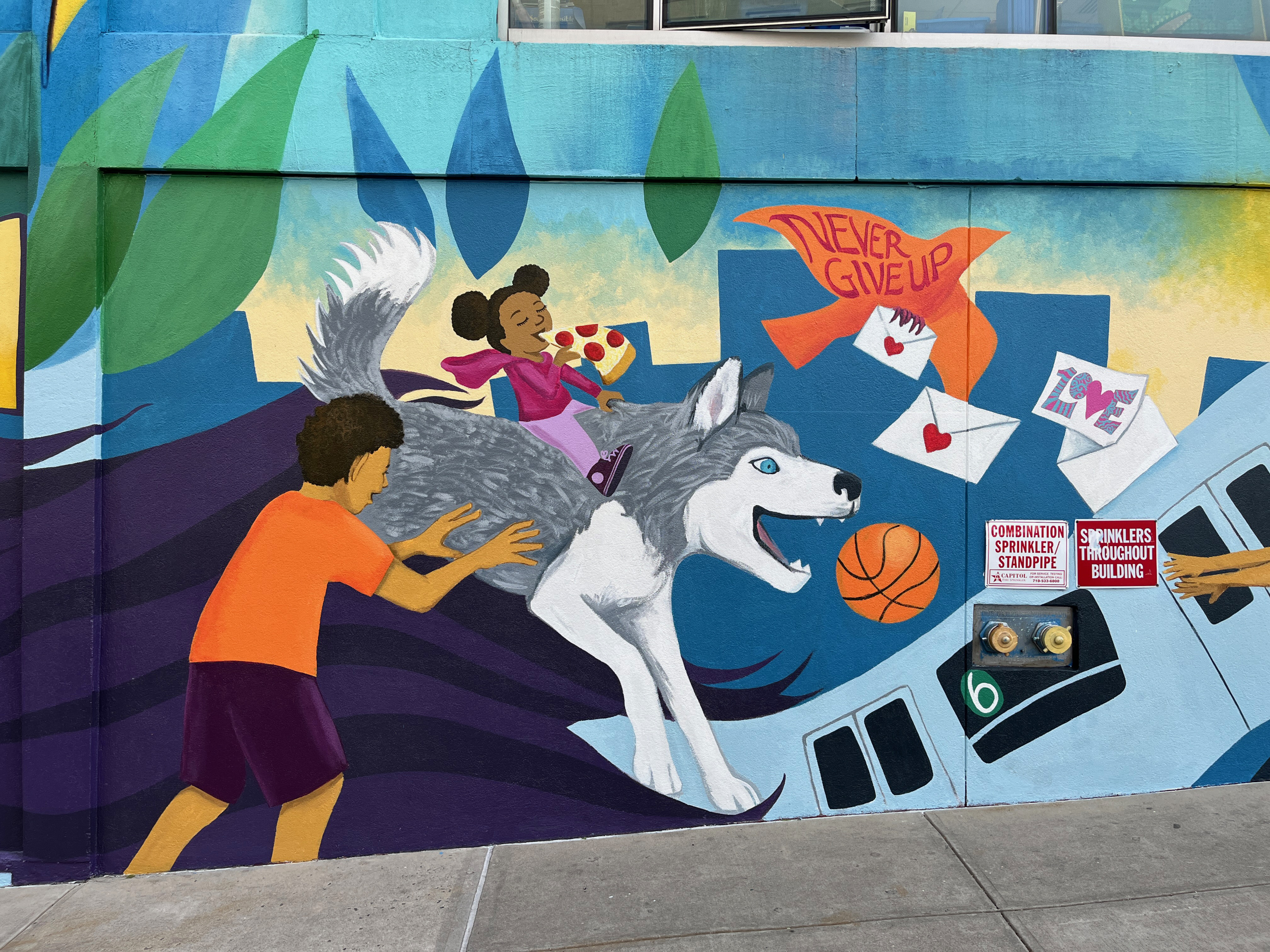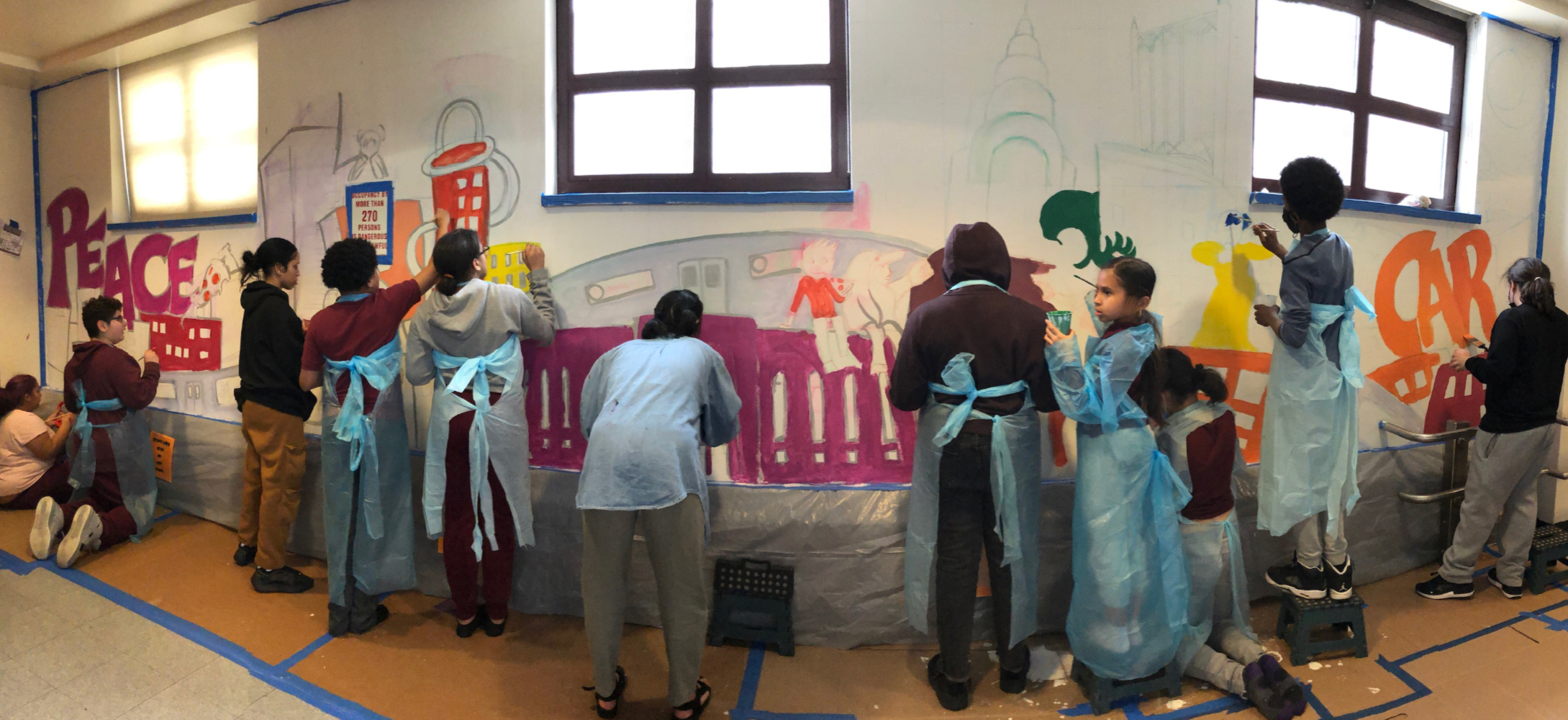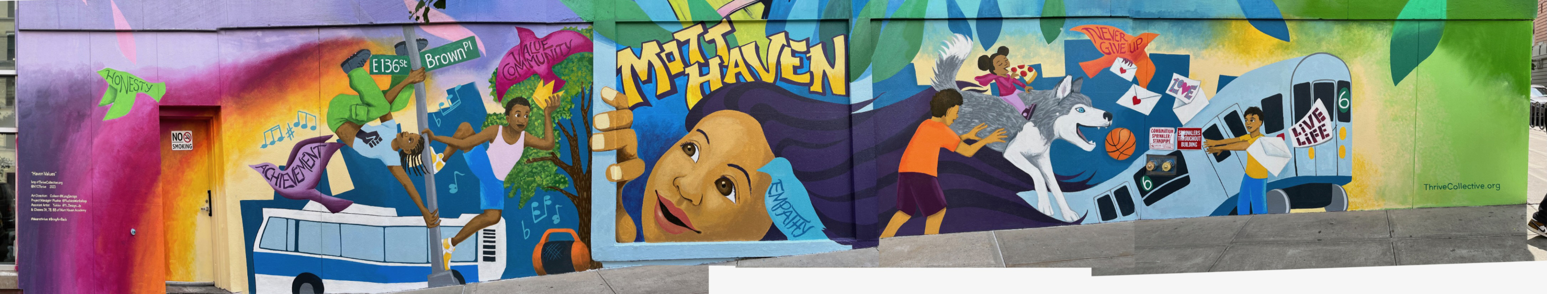 Mott Haven Academy is a Bronx charter school for pre-K to grade 8. Its building showcases an impressive mural of a bird and its aura, stretching across an entire facade. However, areas at ground level had peeled away. The school invited Thrive to guide 7th and 8th graders in creating a new mural for this lower section. We asked students to tell us what is important to them as a community. They shared their school’s core values, expressed pride in their neighborhood and wanted to portray Mott Haven through NYC elements: subways, buses, music, dance, Black Lives Matter, kings and queens, basketball, city skyline. The husky is their mascot.