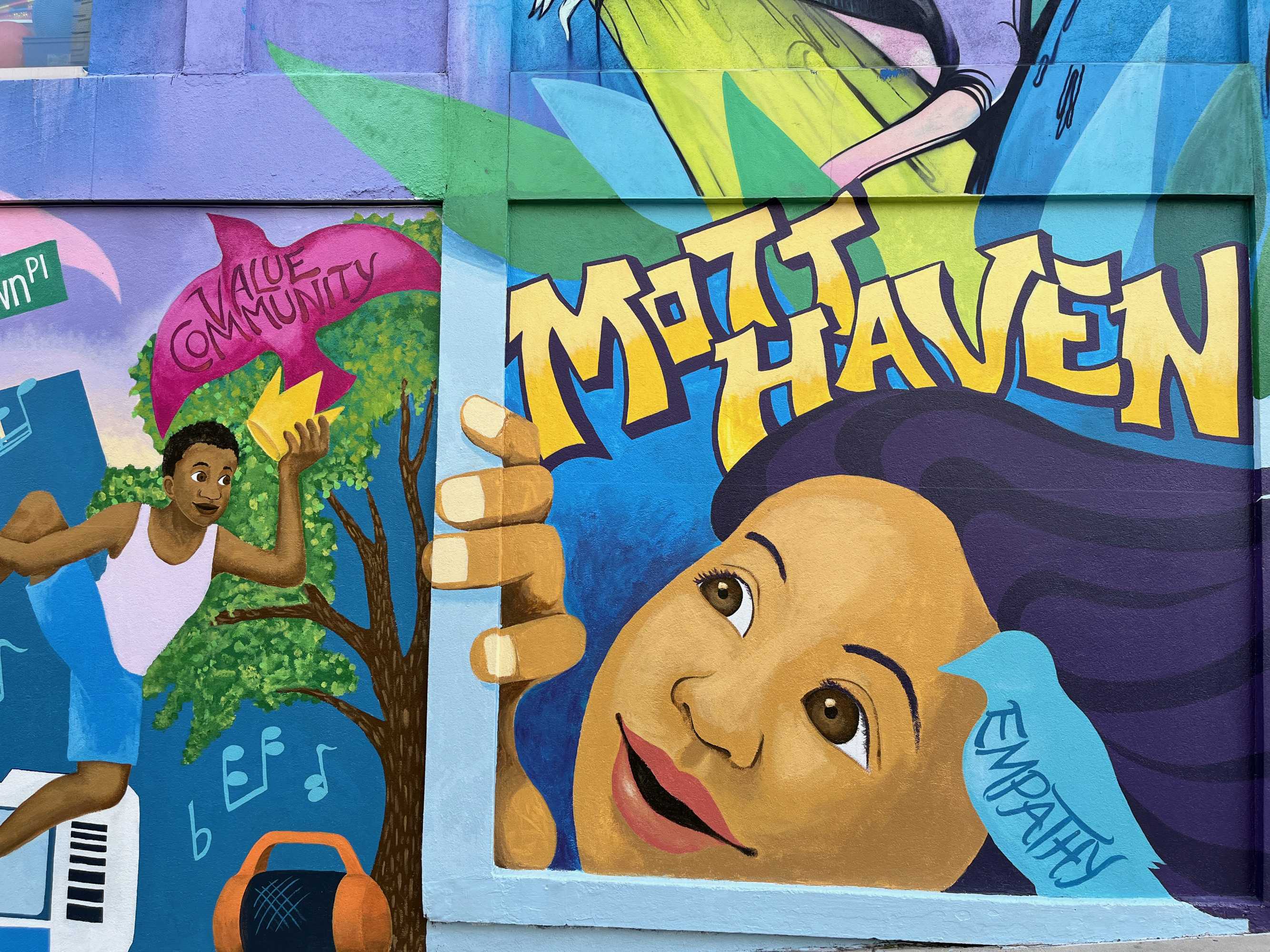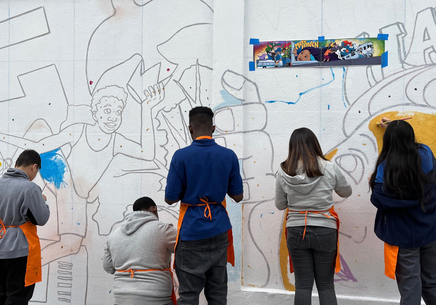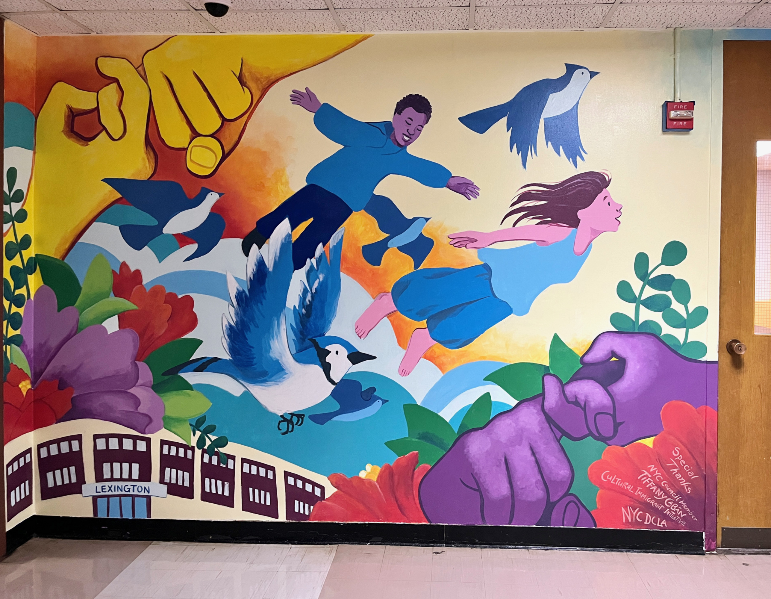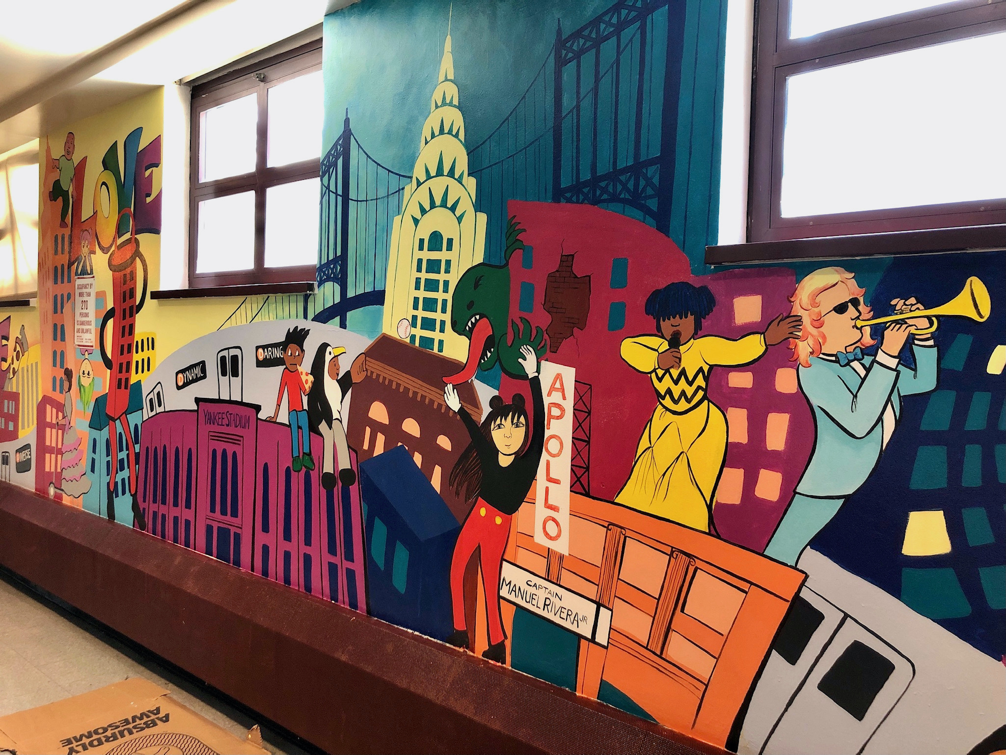 Mott Haven Academy is a Bronx charter school for pre-K to grade 8. Its building showcases an impressive mural of a bird and its aura, stretching across an entire facade. However, areas at ground level had peeled away. The school invited Thrive to guide 7th and 8th graders in creating a new mural for this lower section. We asked students to tell us what is important to them as a community. They shared their school’s core values, expressed pride in their neighborhood and wanted to portray Mott Haven through NYC elements: subways, buses, music, dance, Black Lives Matter, kings and queens, basketball, city skyline. The husky is their mascot.