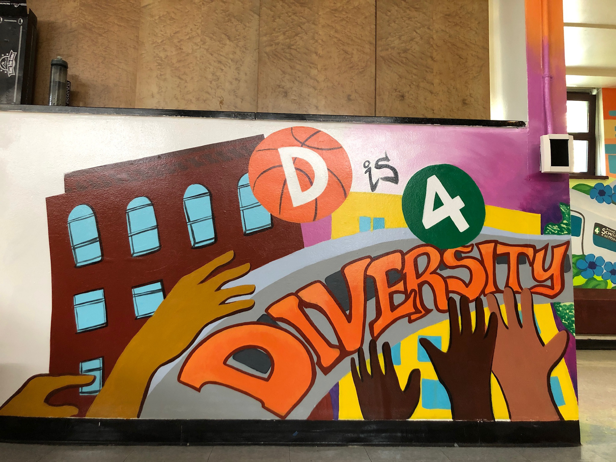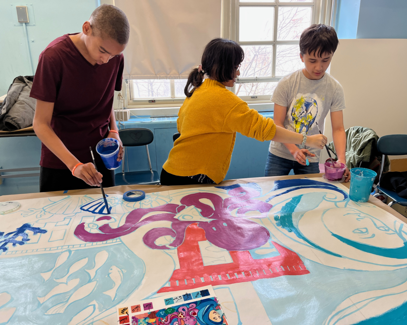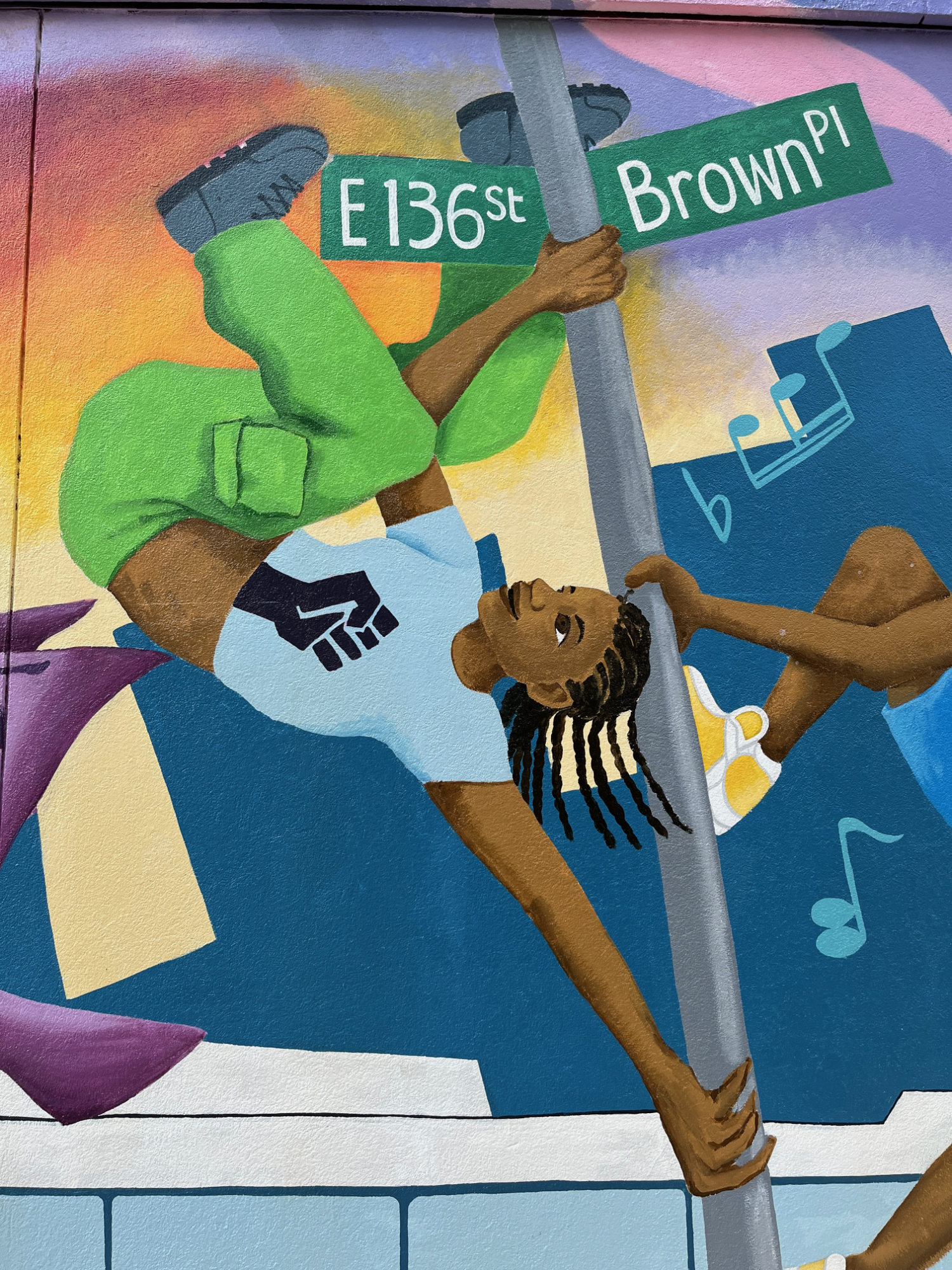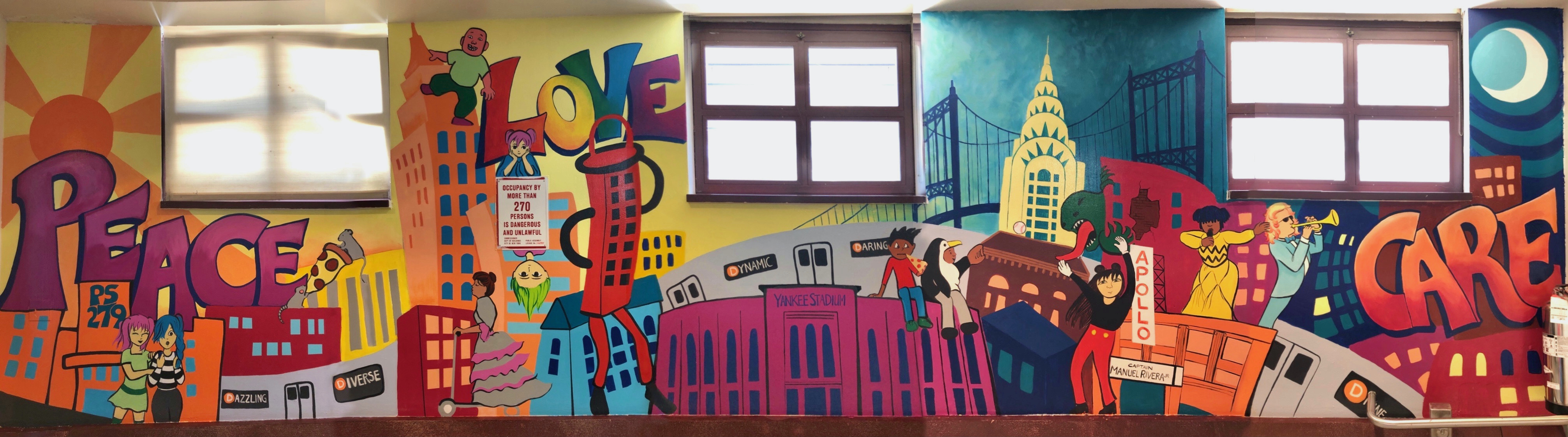 Mott Haven Academy is a Bronx charter school for pre-K to grade 8. Its building showcases an impressive mural of a bird and its aura, stretching across an entire facade. However, areas at ground level had peeled away. The school invited Thrive to guide 7th and 8th graders in creating a new mural for this lower section. We asked students to tell us what is important to them as a community. They shared their school’s core values, expressed pride in their neighborhood and wanted to portray Mott Haven through NYC elements: subways, buses, music, dance, Black Lives Matter, kings and queens, basketball, city skyline. The husky is their mascot.