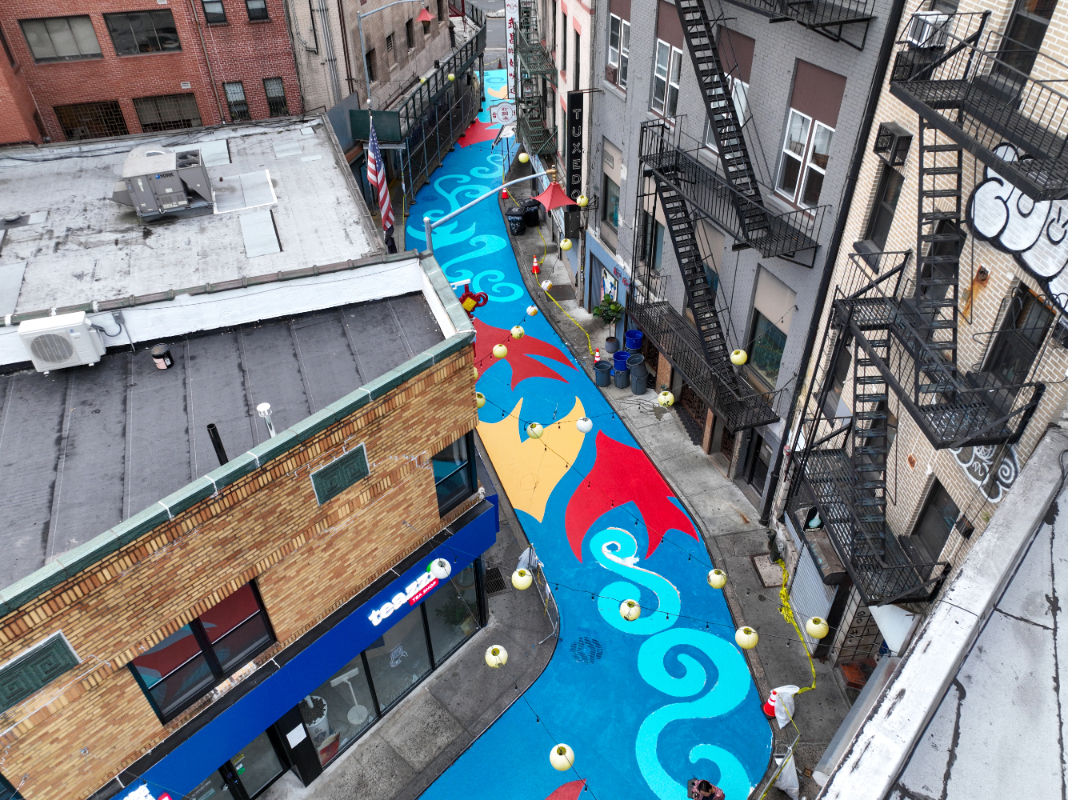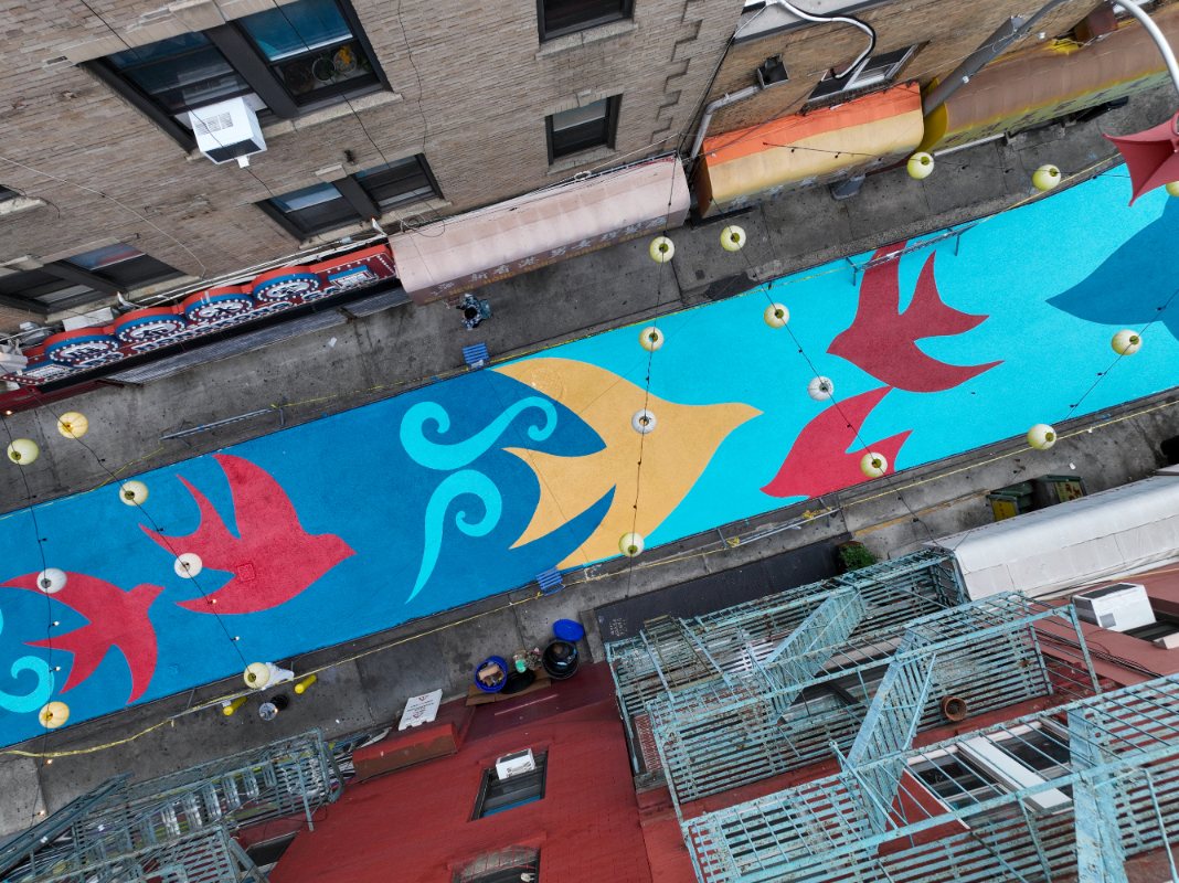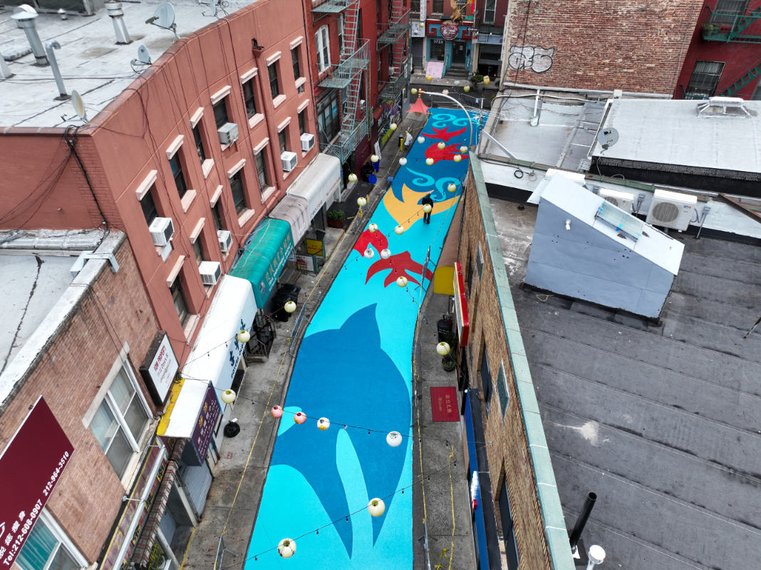 Here’s a link to NTD TV news coverage. Brief English summary: NTD News describes the community’s four-day process of artists and volunteers painting the mural “Stories in Flight.” Doyers Street is one of the oldest streets in Chinatown NY. Because it is so narrow and curved, in the past it was a gathering place for gangs. Times have changed, and it is now a prosperous place for community businesses. The mural is part of an initiative by Chinatown Business Improvement District and NYC Dept of Transportation to attract visitors to the area to support Chinatown’s small businesses and beautify the neighborhood. Community leader Wellington Chen said that Chinatown has more than 240 pedestrian streets, but there is no official square where people can gather. Doyers Street has already become a new landmark, giving the community a place to meet and celebrate festivities together.