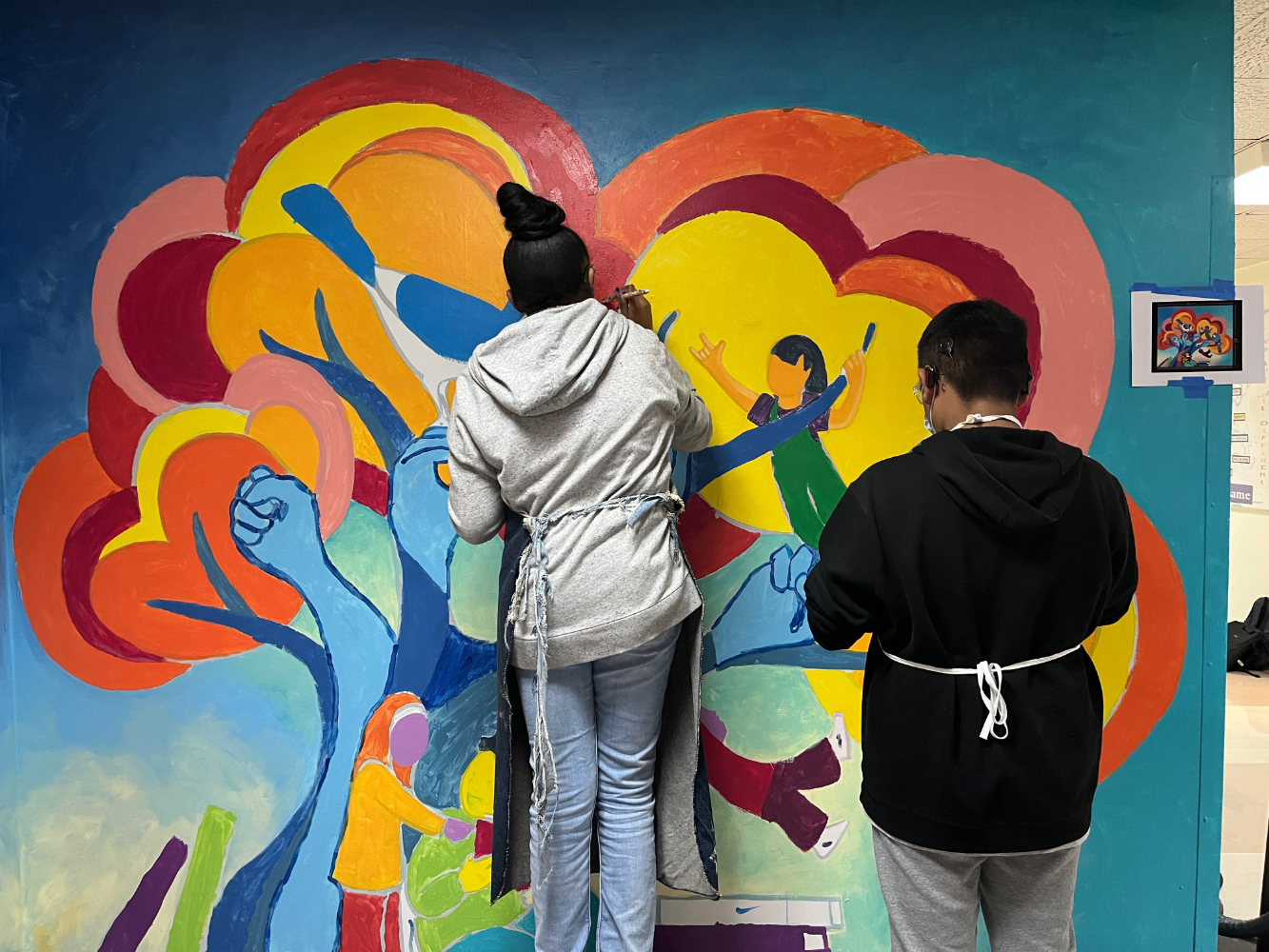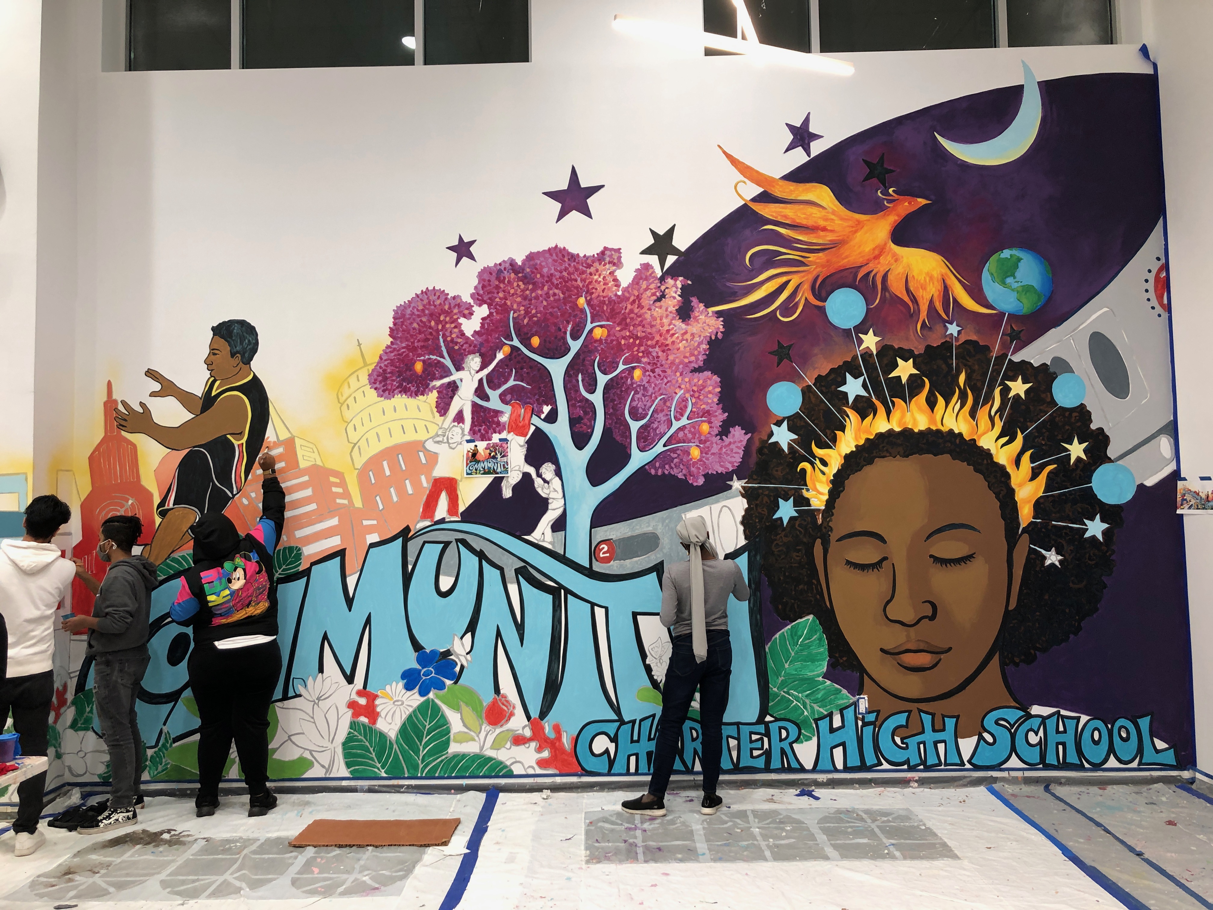 Seniors of South Bronx Community Charter High School partnered with Thrive Collective to create a mural celebrating their new building. We explored Afrofuturism, imagining a tomorrow built on the foundation of today.