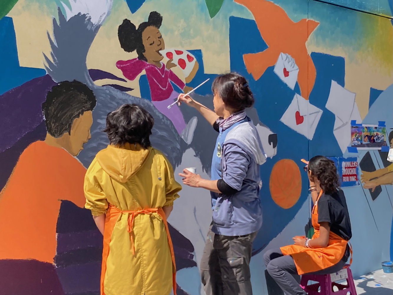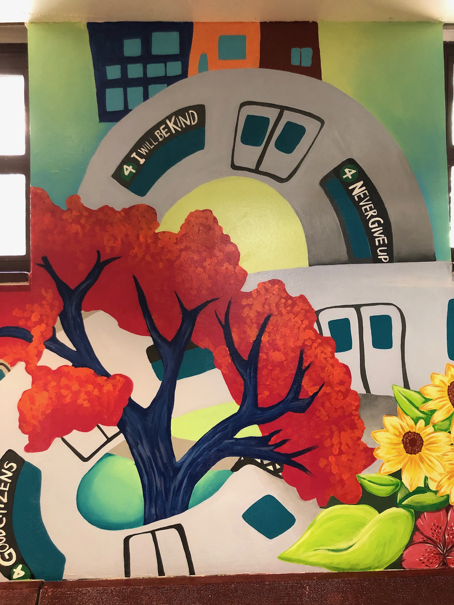Many people dread drawing. But everyone has ideas—ideas of who they are, observations about the world, thoughts they want to share. I tell students to make chicken scratch drawings with stick figures, diagrams with written notes. I gather their concepts and stitch them into a mural design. The most magical point is when students recognize their concepts in the mural. What a thrill to understand you have something worth sharing with the rest of the world. How meaningful it is to feel seen.