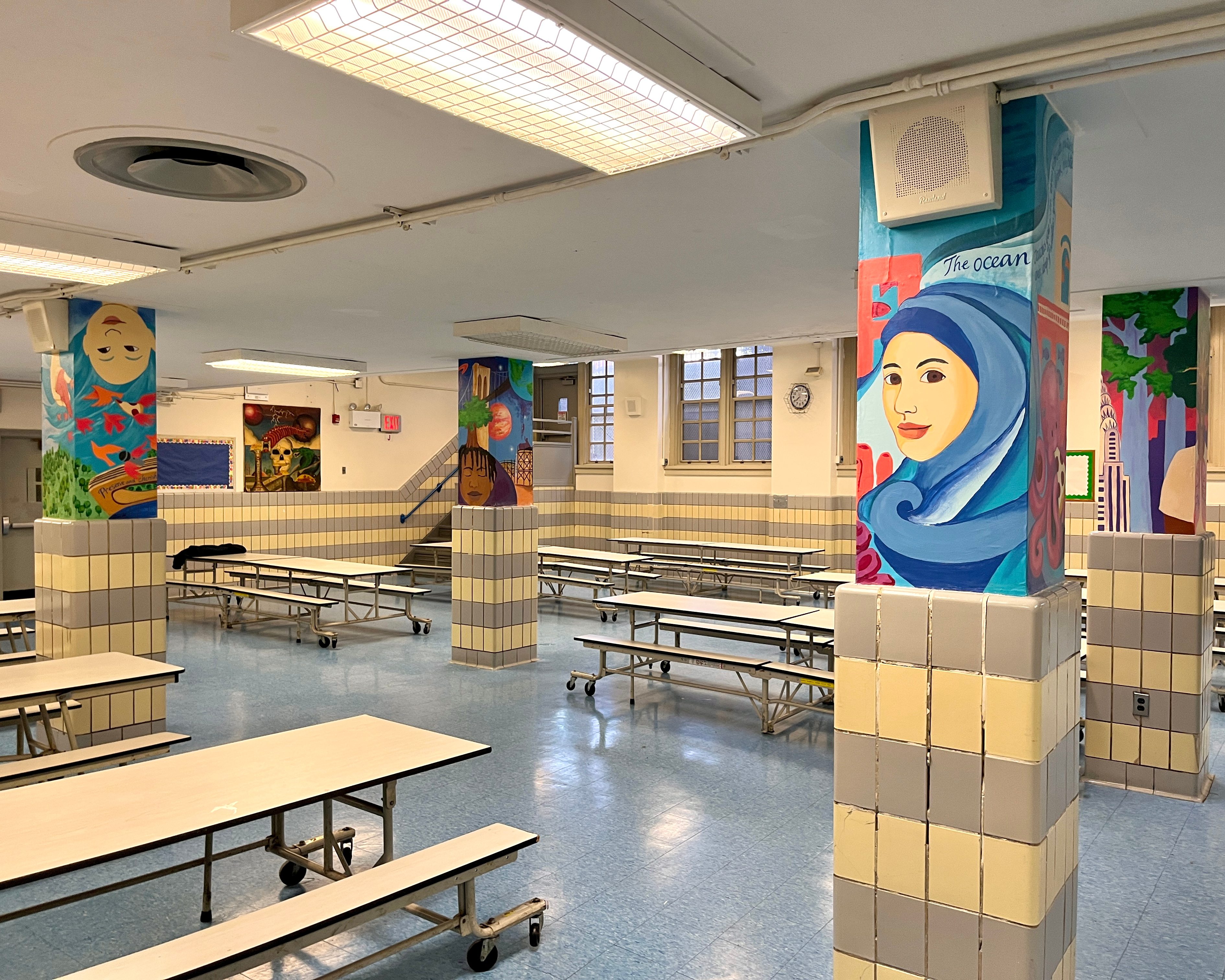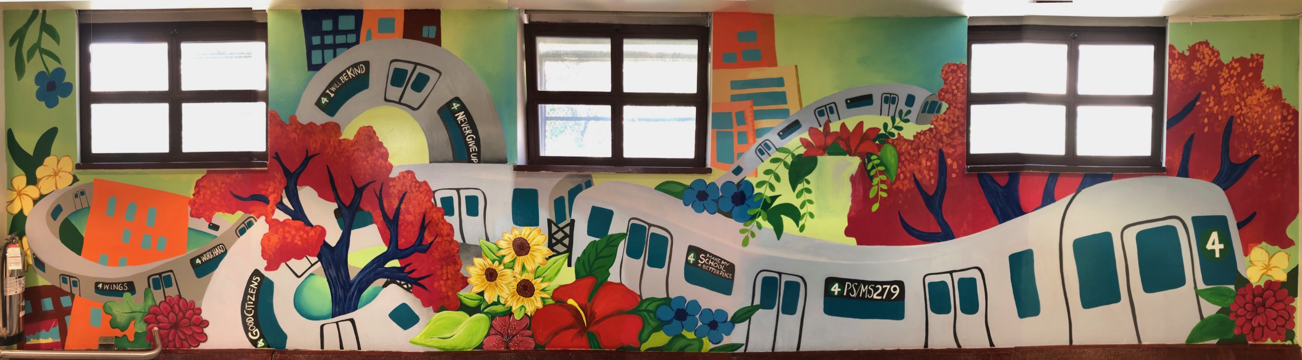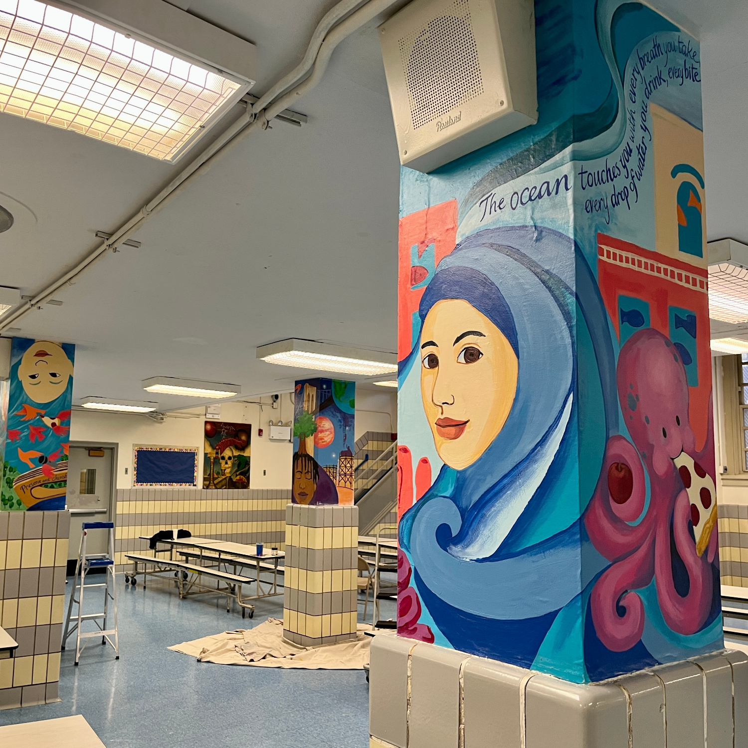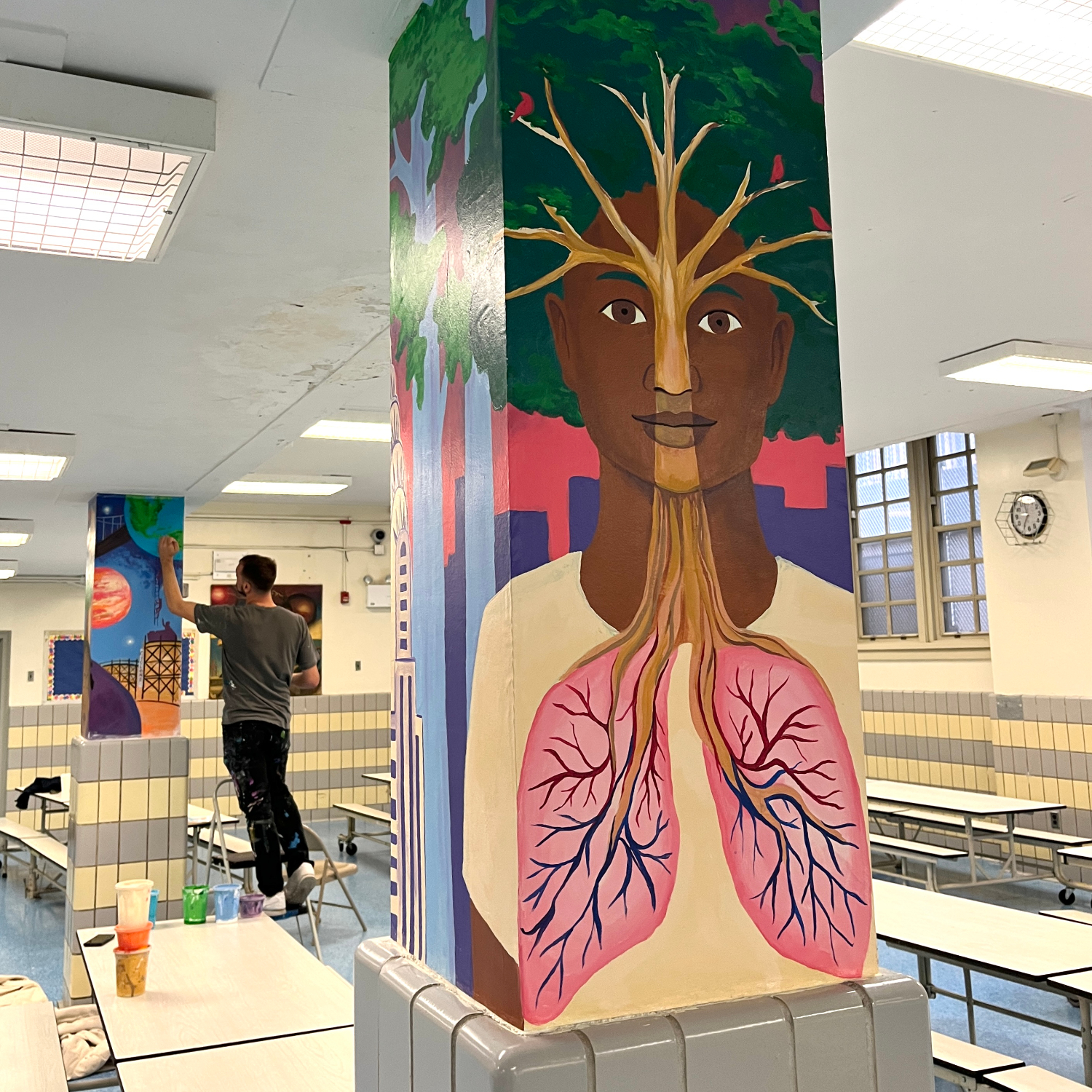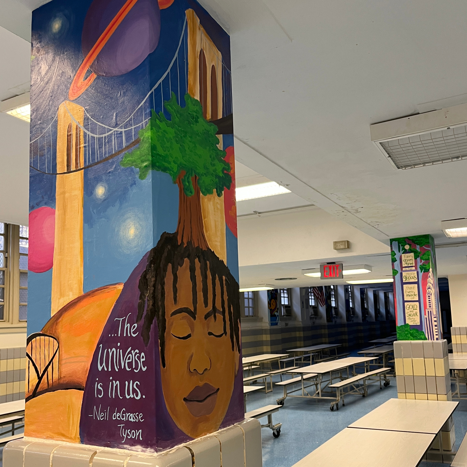 A small and talented crew of Brooklyn middle schoolers contemplated humans’ effect on the planet and environment. We took inspiration from quotes and referenced home by including NYC and Brooklyn landmarks. One 7th grader commented, “When you’re connected to nature, you’re connected to yourself.” We painted the images on polytab canvases, which were later installed on four pillars in the cafeteria—one pillar was dedicated to land, another to air, another to water, and the final one to the universe.