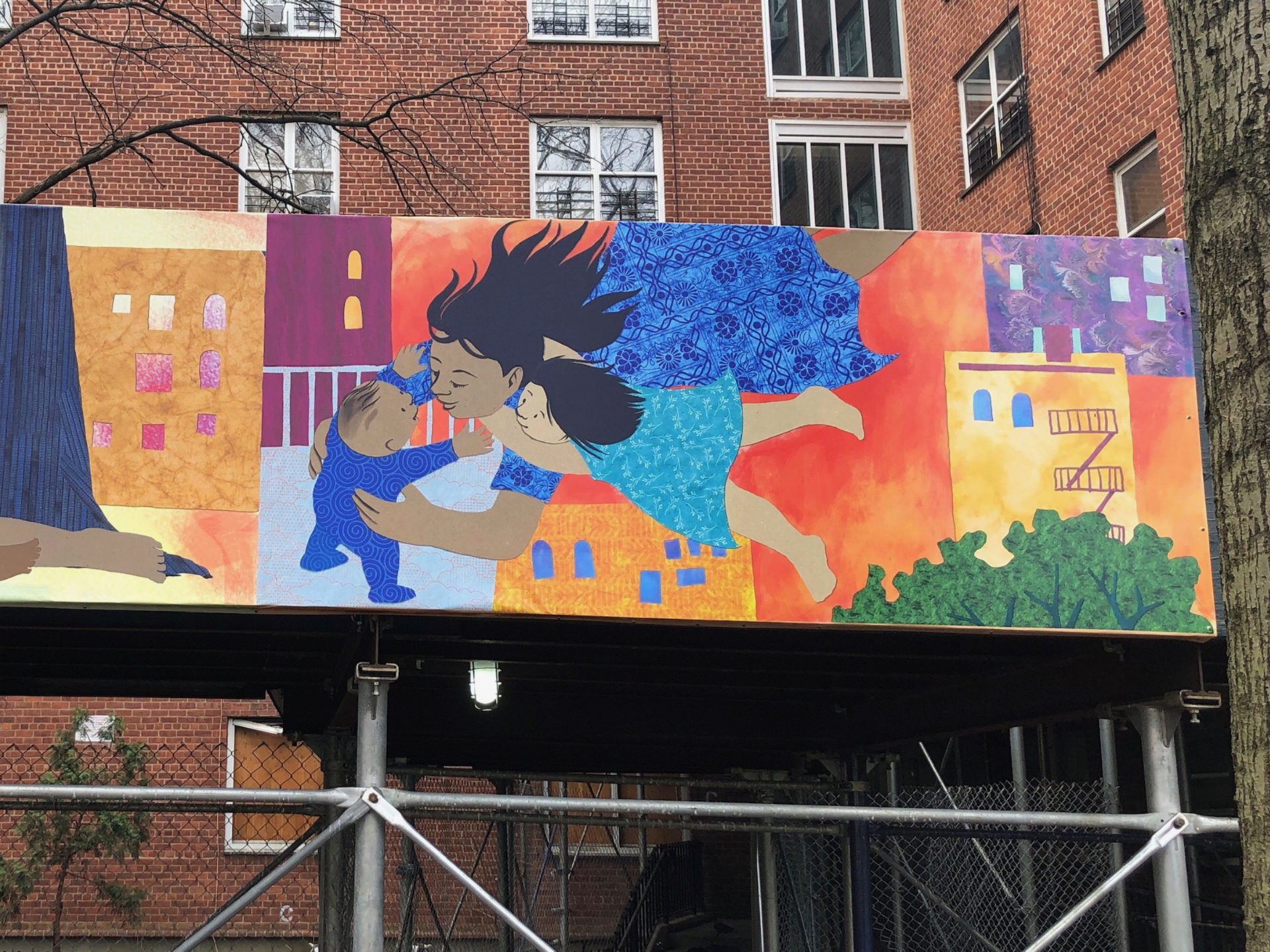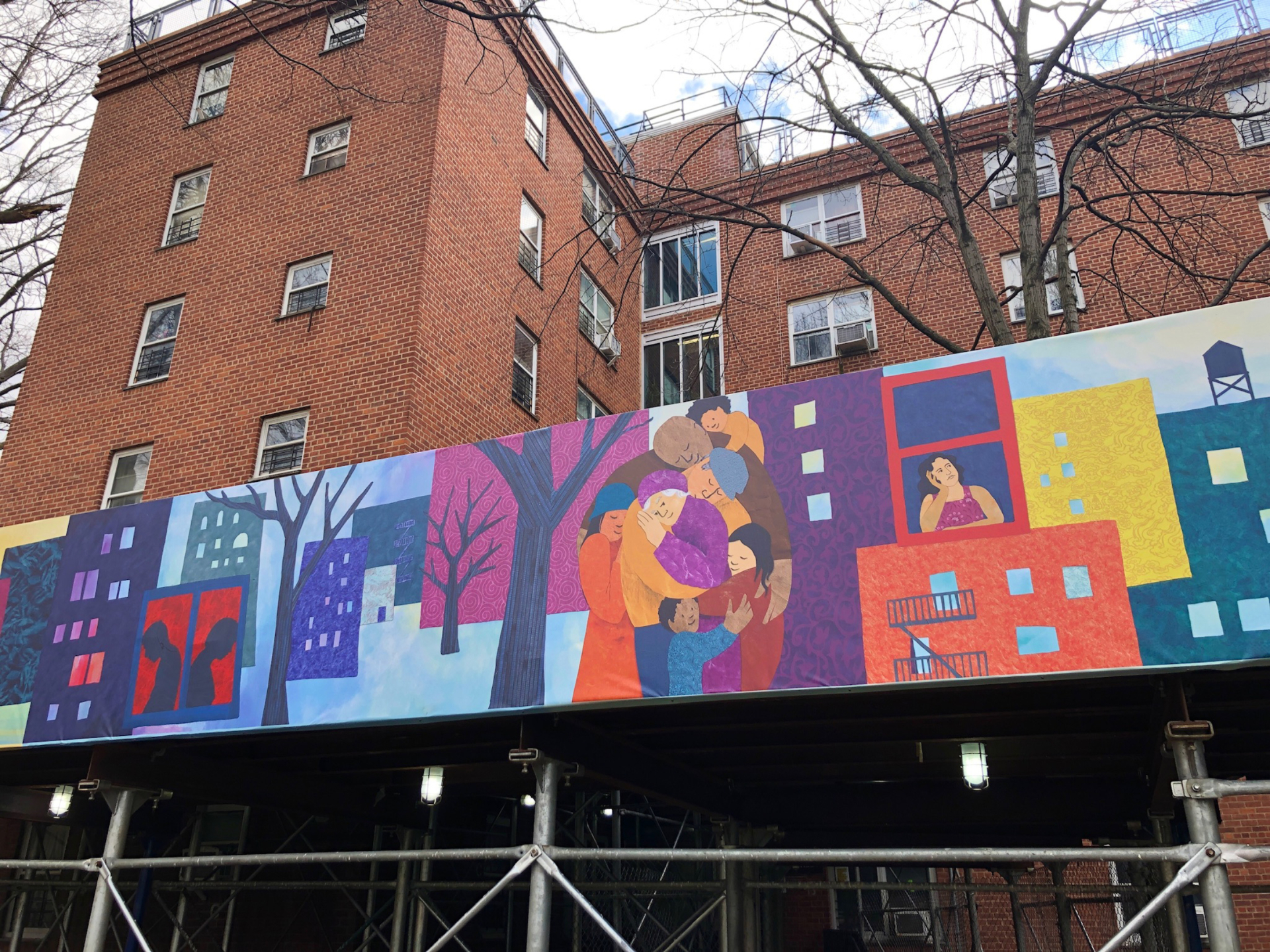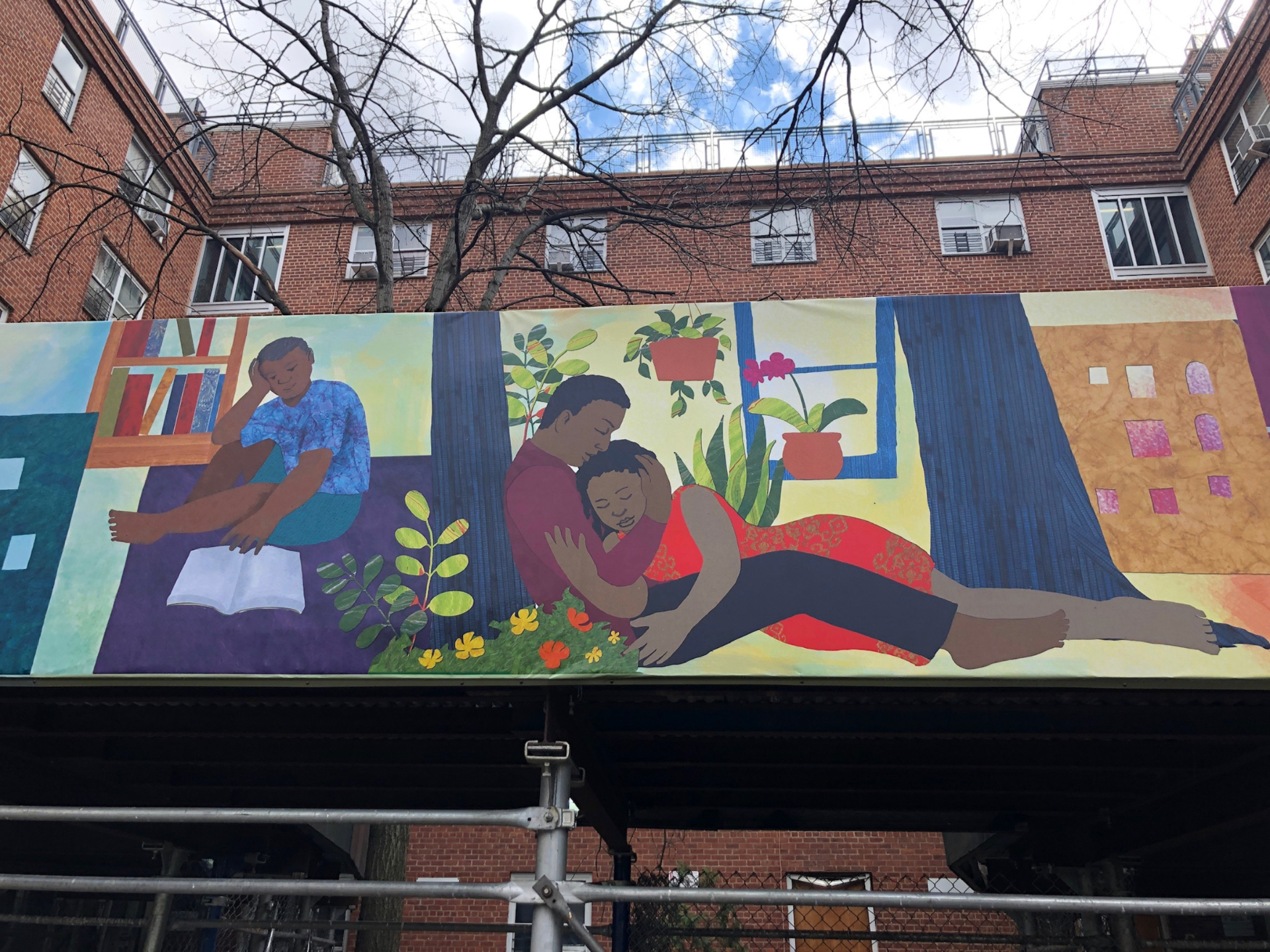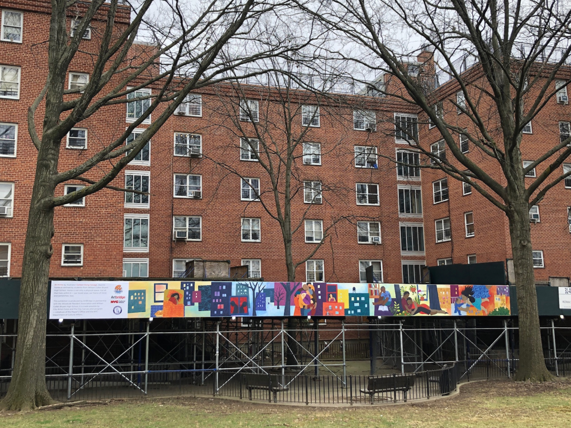As an artist in the City Canvas program, I was assigned to create artwork for Woodside NYCHA houses. (See Pix11 news on this public art project) Fellow artists and I were also tasked with leading workshops, where community members had an opportunity to be creative. Workshop attendees helped conceptualize the artwork, which was printed on vinyl, then installed on one of the many long-standing scaffolds in their development. My piece explored the idea of home. Students from neighboring William Cullen Bryant high school were asked to describe home. Among the answers: where I sleep, difficult and hard, my family, where I can be by myself, where I think.